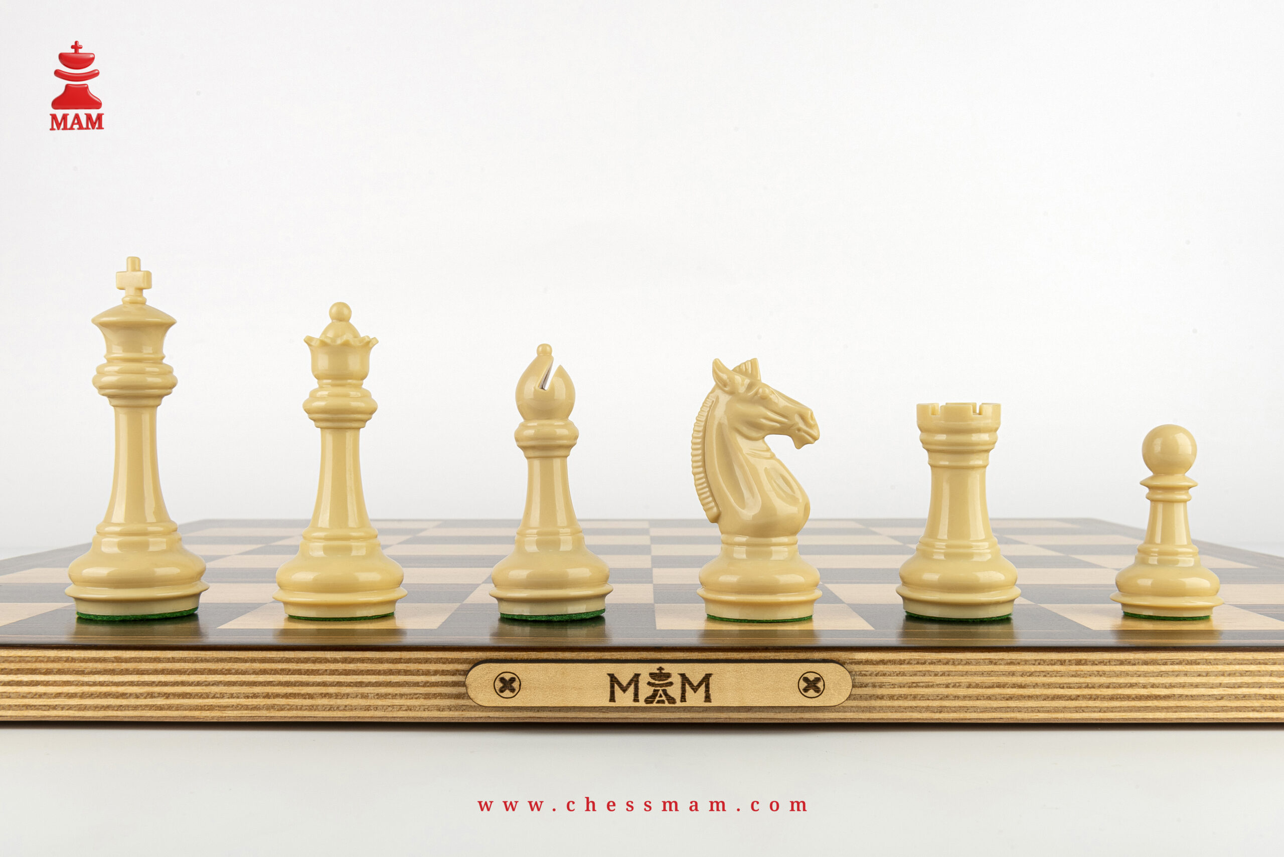 A luxury tournament size acrylic ,for durability , it’s really WOW ) pieces 3.75 inch (9.5 cm, King size) , non-breakable, has a green soft base felt for a smooth sliding over the board and it comes with two extra queens for promotion.